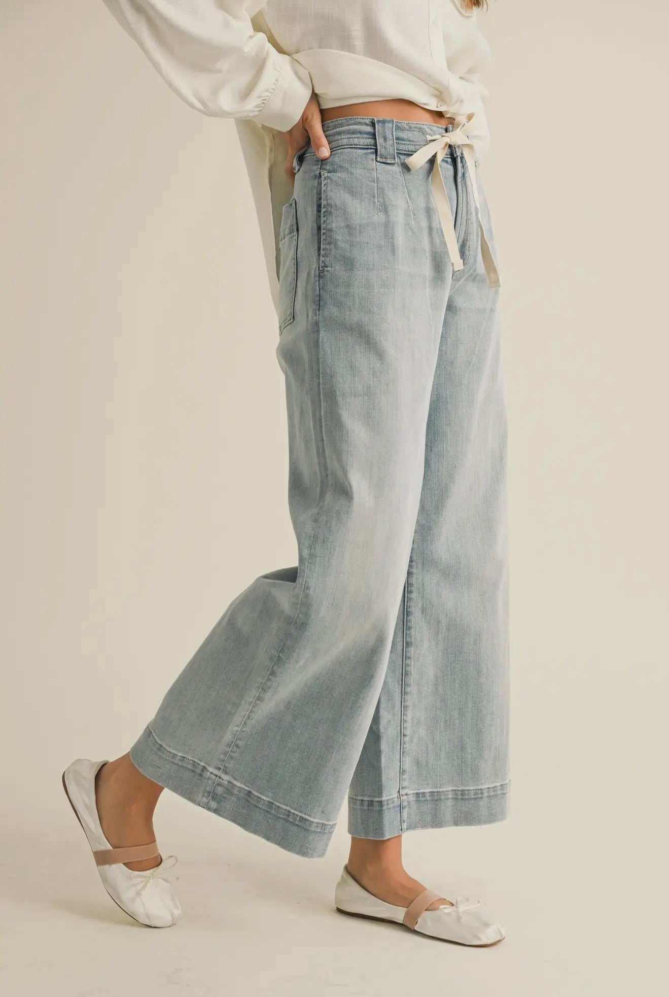 Washed denim / Medium / Tie front wide leg pants