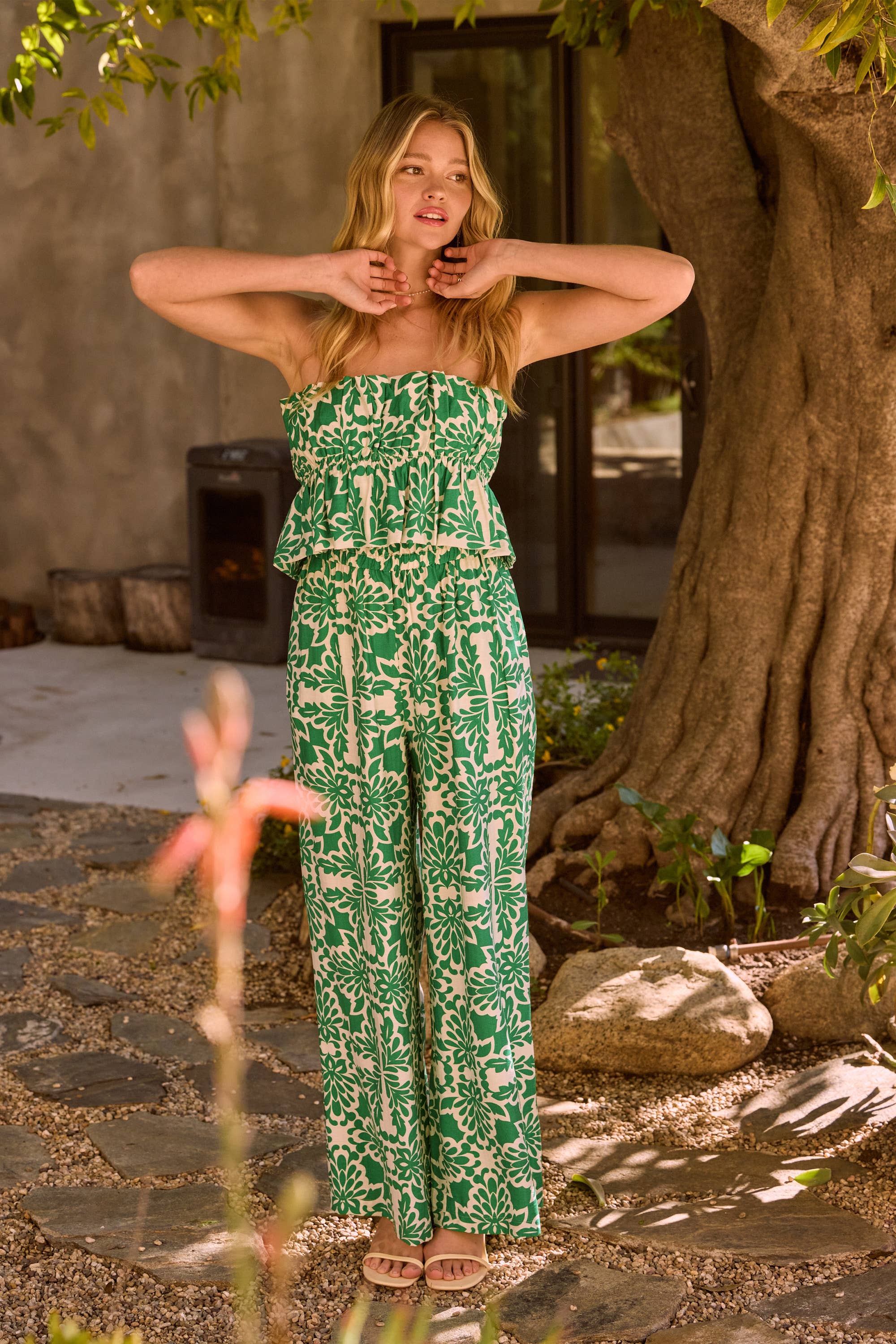 Printed Strapless Wide-Leg Jumpsuit Effortless and statement-making, this printed strapless jumpsuit features a flowy wide-leg silhouette for a flattering, modern look. Designed with a lightweight feel and easy drape, it moves beautifully while offering all-day comfort. The strapless neckline highlights the shoulders, making it perfect for warm-weather occasions. Style it with sandals for a casual daytime look or dress it up with heels and accessories for an elevated finish. printed jumpsuit, strapless jumpsuit, wide-leg jumpsuit, summer jumpsuit, boho jumpsuit, statement jumpsuit