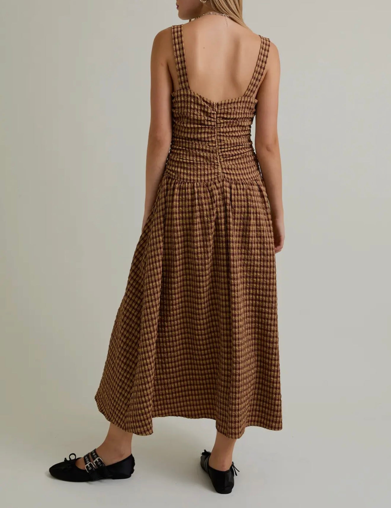 Tan/brown check / Medium / Dropped waist midi dress