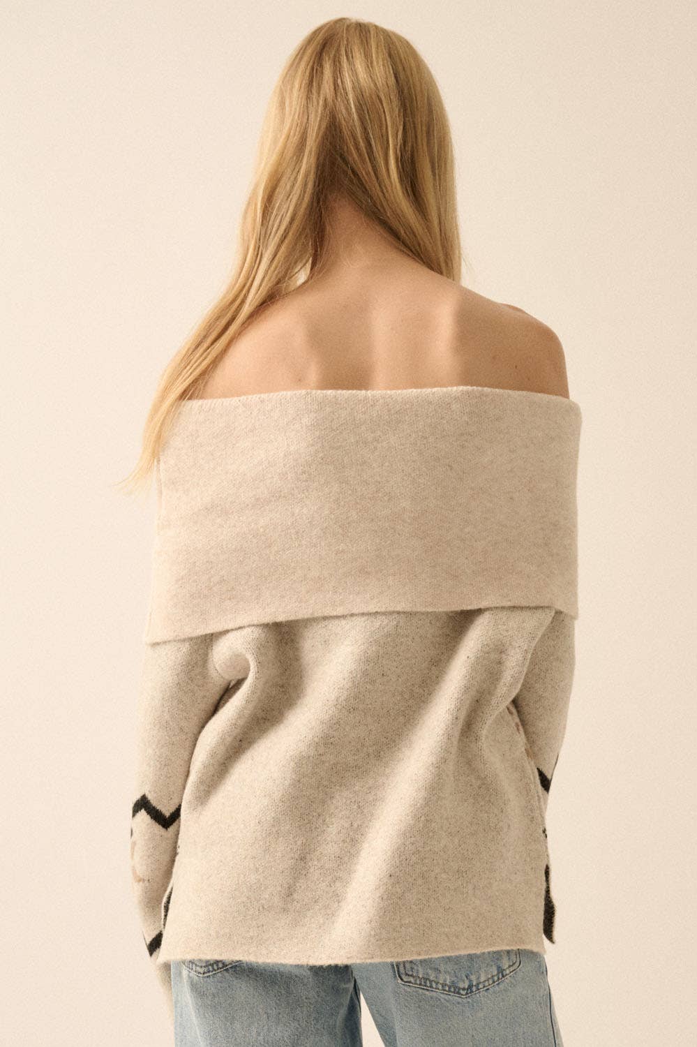 Alpine floral knit pattern. Off-shoulder with oversized foldover collar. Long sleeves. Thigh length. Relaxed fit.