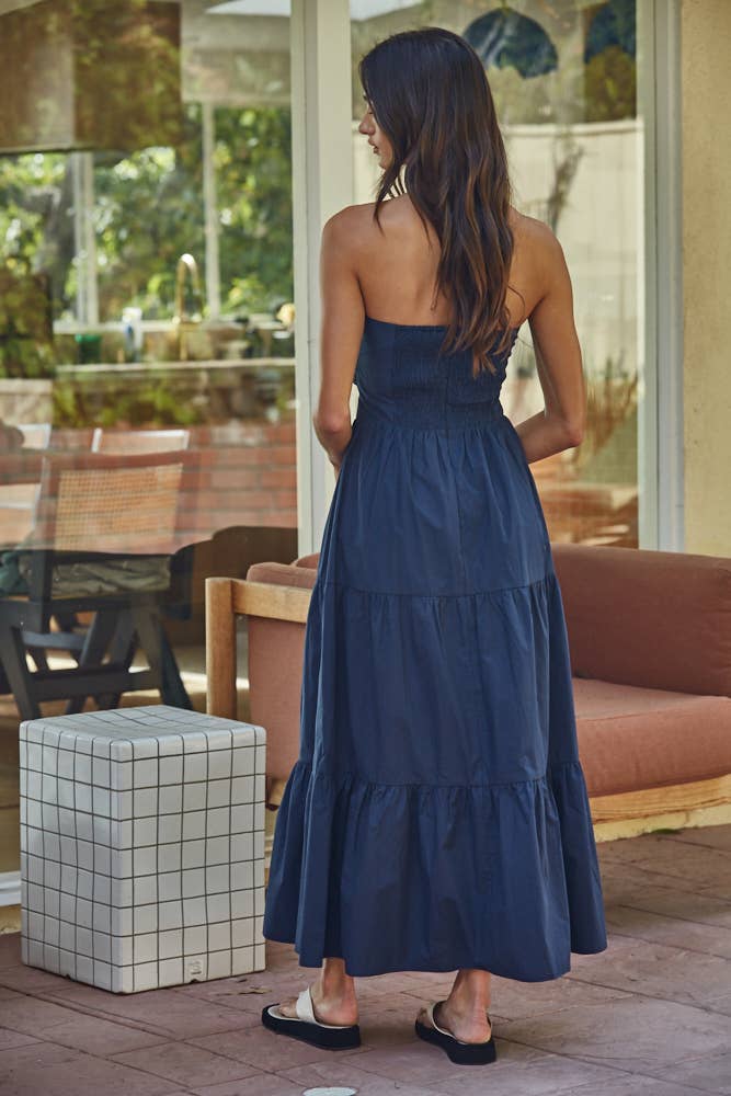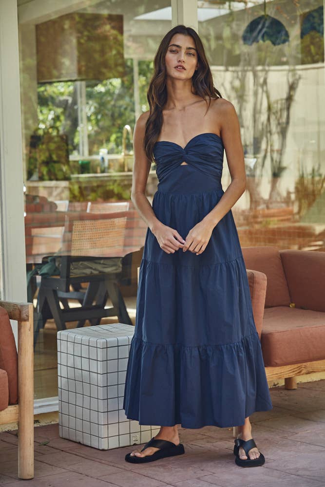 Woven Cotton Tiered Sweetheart Neck Strapless Twist Front Midi Dress With Back Smocking Back Zipper And Rayon Lining